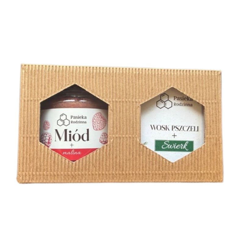 Pasieka Rodzinna zestaw prezentowy miód malinowy 240 g + świeca z wosku pszczelego świerk 120 ml