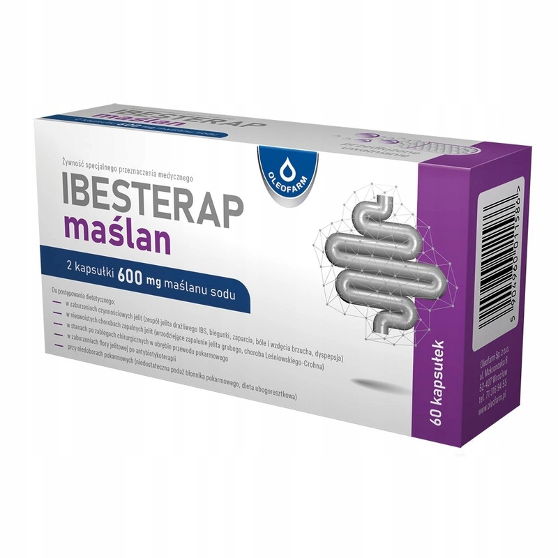 Oleofarm Ibesterap Maślan to żywność specjalnego przeznaczenia medycznego dla dzieci powyżej 7 roku życia i dorosłych, u których występują zaburzenia czynności jelit. Preparat ma formę kapsułek zawierających mikropeletki pokryte powłoką zapewniającą stopniowe uwalnianie maślanu sodu do 8 godzin po spożyciu.