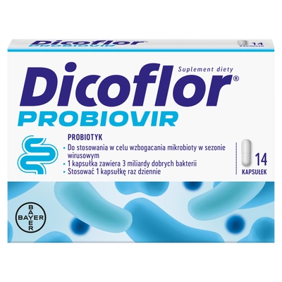Dicoflor ProbioVir to probiotyk szczególnie zalecany do stosowania w celu wzbogacania mikrobioty jelitowej w sezonie wirusowym.