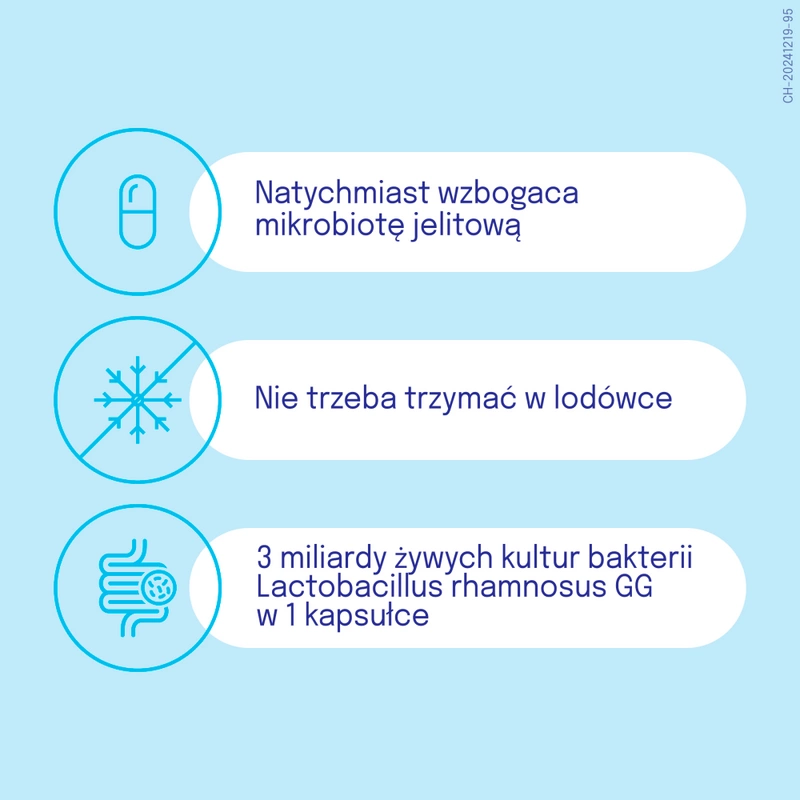 1 kapsułka zawiera 3 miliardy żywych kultur bakterii Lactobacillus rhamnosus GG (ATCC 53103), o udowodnionym w badaniach klinicznych bezpieczeństwie stosowania.