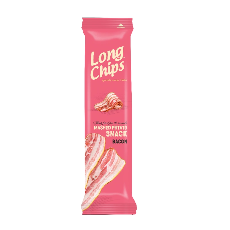 Long Chips Bacon o smaku bekonu to wyjątkowe przekąski ziemniaczane. Smażone w wysokiej jakości oleju rzepakowym tylko przez 10 sekund, przez co są niesamowicie chrupkie i nie są tak tłuste jak klasyczne chipsy. Long Chips mają oryginalny kształt - są długie, płaskie i bardzo cienkie. Umieszczone w tacce, aby nie uległy zniszczeniu. Są dostępne w starannie dobranych smakach.