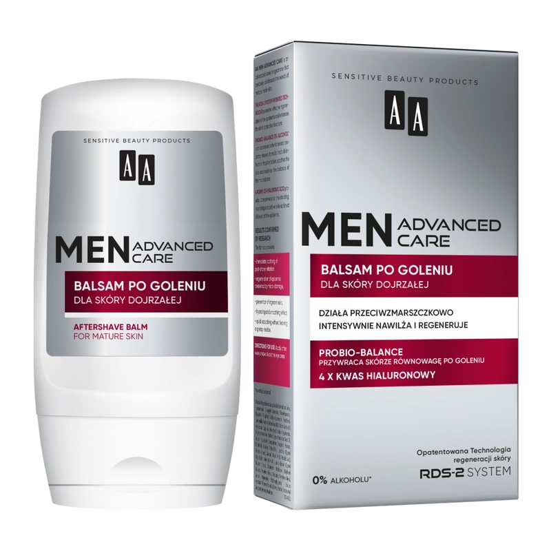 Balsam po goleniu AA Men Adanced Care precyzyjnie odpowiada na potrzeby dojrzałej męskiej skóry. Natychmiastowo koi podrażnienia skóry po goleniu oraz działa przeciwzmarszczkowo, intensywnie nawilża i regeneruje mikrouszkodzenia naskórka. Kompleks Probio-Balance 0% alkoholu* na bazie oktenidyny i probiotyków dezynfekuje bez podrażnień i łagodzi jak kompres oraz przywraca równowagę mikrobiomu.
