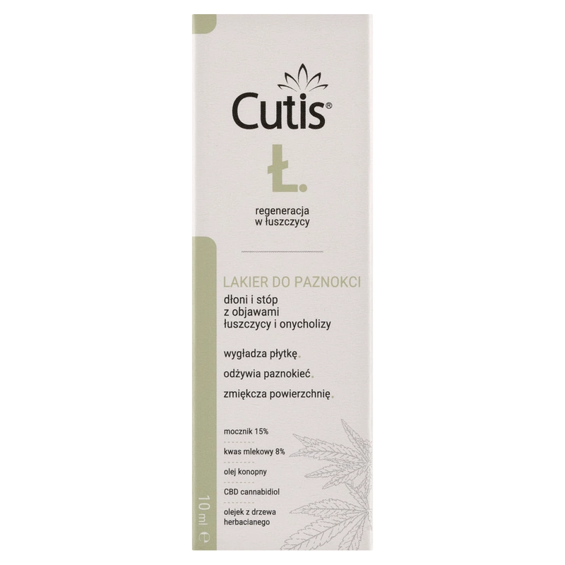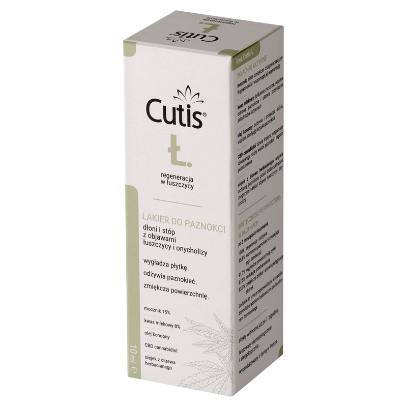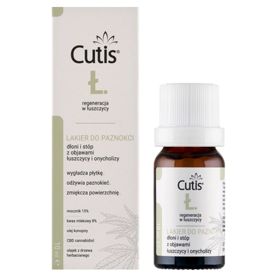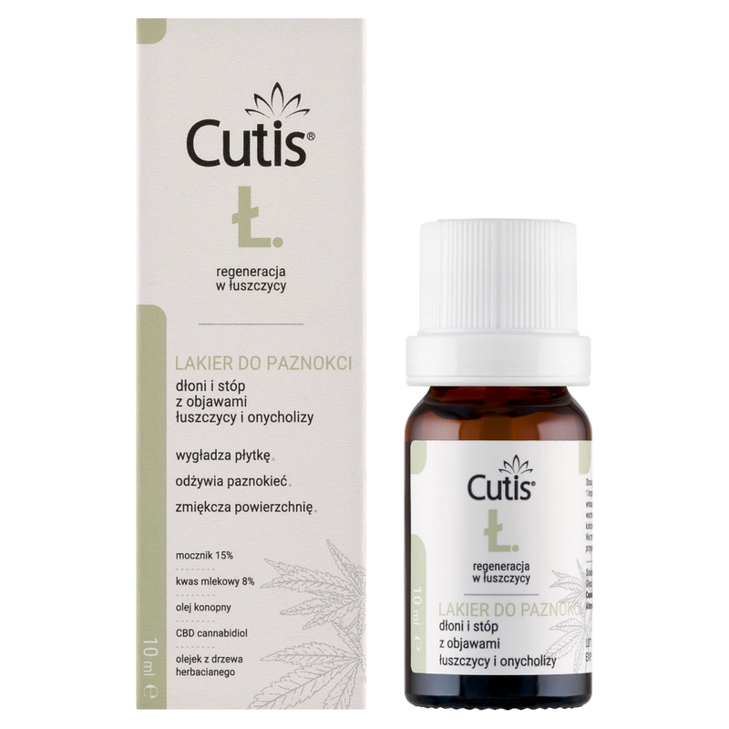 - Cutis Ł-Łuszczyca lakier do paznokci + CBD na objawy onycholizy i łuszczycy poprawia kondycję płytki paznokciowej, wygładzając ją, odżywiając oraz normalizując jej grubość.