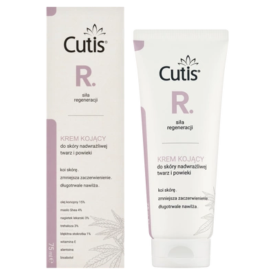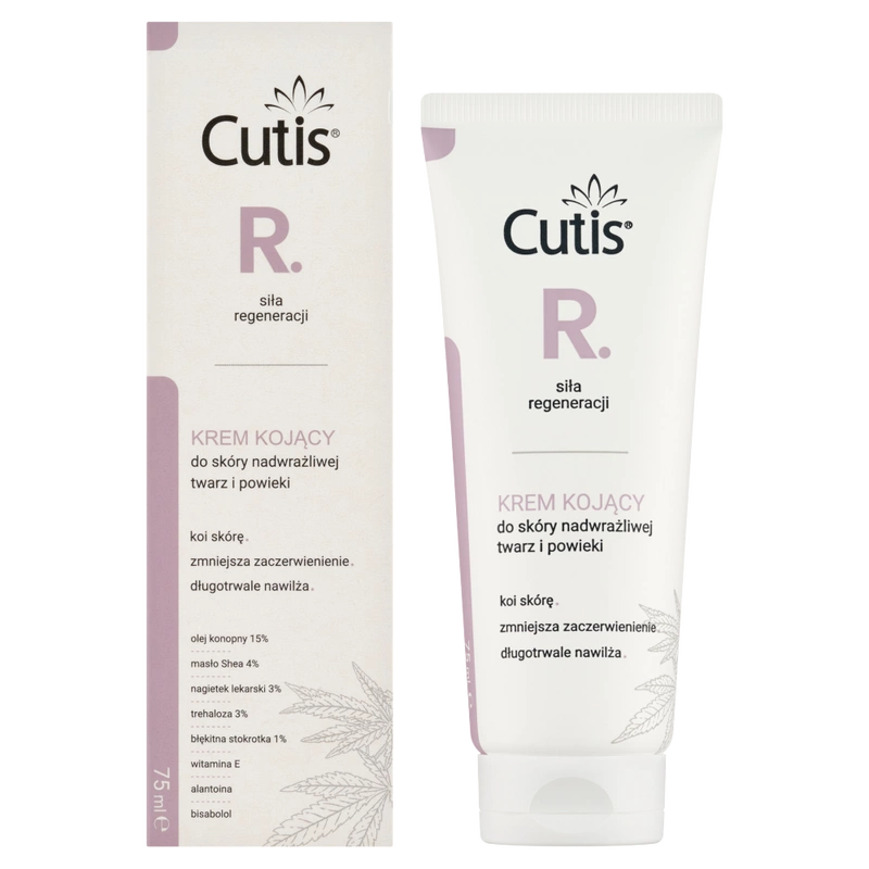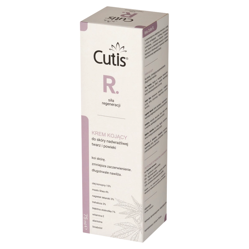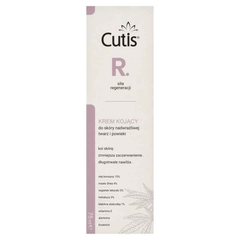Składniki (INCI) Aqua, Cannabis Sativa (Hemp) Seed Oil (olej z konopi siewnych), Butyrospermum Parkii (Shea) Butter (masło shea), Caprylic/Capric Triglyceride, Trehalose, Polyglyceryl-6 Stearate, Helianthus Annuus (Sunflower) Seed Oil (olej z nasion słonecznika), Cetearyl Alcohol, Glyceryl Stearate, Pentylene Glycol, Myristyl Myristate, Globularia Alypum Leaf Extract (wyciąg z liści kulnika), Calendula Officinalis Flower Extract (ekstrakt z nagietka lekarskiego), Tocopherol (witamina E), Bisabolol (bisabolol), Tocopheryl Acetate (pochodna wit E), Acacia Senegal Gum, Polyglyceryl-6 Behenate, Allantoin (alantoina), Xanthan Gum, Glycerin (gliceryna), Hydroxyacetophenone, Lactic Acid (kwas mlekowy).