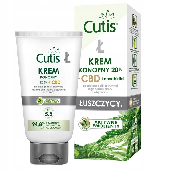 Cutis Ł-Łuszczyca, krem konopny 20% + CBD to aktywny emolient na bazie oleju konopnego o lepszej formule, wzbogaconej gwarantowaną zawartością CBD - kannabidiolu, substancji aktywnej o silnych właściwościach przeciwzapalnych, przeciwalergicznych i antybakteryjnych.