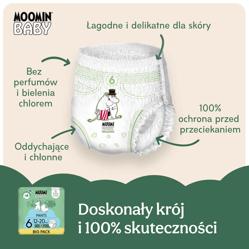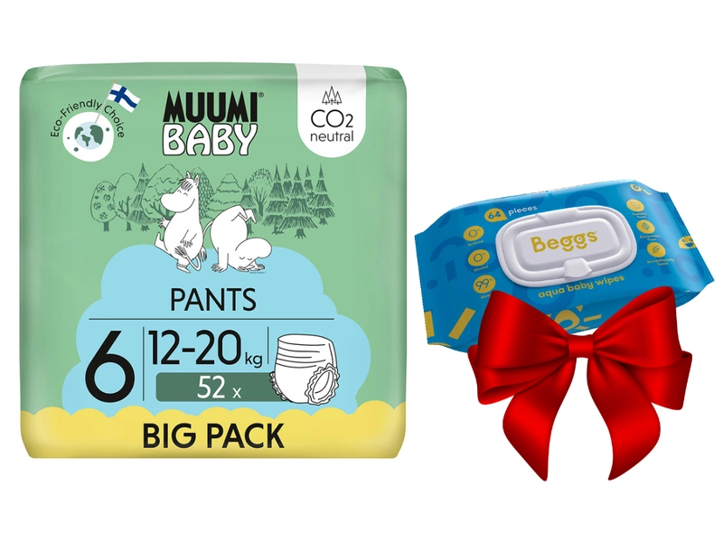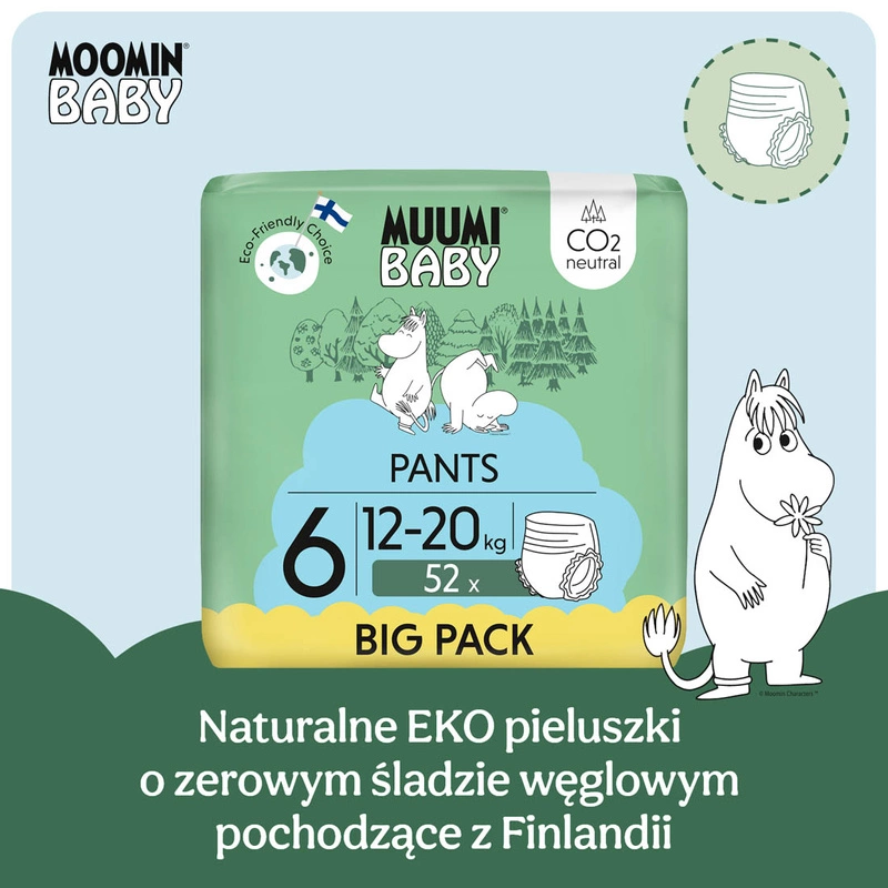 Muumi Baby Pants 6 Junior 12-20 kg (52 szt), eko pieluchomajtki + CHUSTECZKI BEGGS GRATIS!