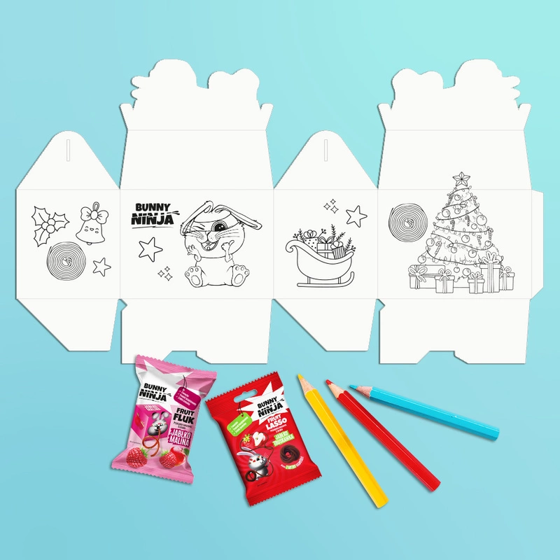 Owocowe słodycze od Bunny Ninja zamknięte w wyjątkowej kreacji świątecznego domku! W środku znajdziesz dwanaście zdrowych przekąsek w czterech rodzajach: FRUIT ROLLS, FRUIT STRAWS, FRUIT FLUK oraz FRUIT LASSO - prawdziwe hity wśród najmłodszych! Owocowe słodycze to doskonały wybór na prezent, ponieważ są pozbawione dodatku cukru i cechują się prostym składem. Dodatkowo, zestaw prezentowy Bunny Ninja zawiera w środku kredki oraz kolorowankę nadrukowaną wewnątrz pudełka! W te Święta moc zdrowo-owocowej zabawy zapewnia Bunny Ninja!