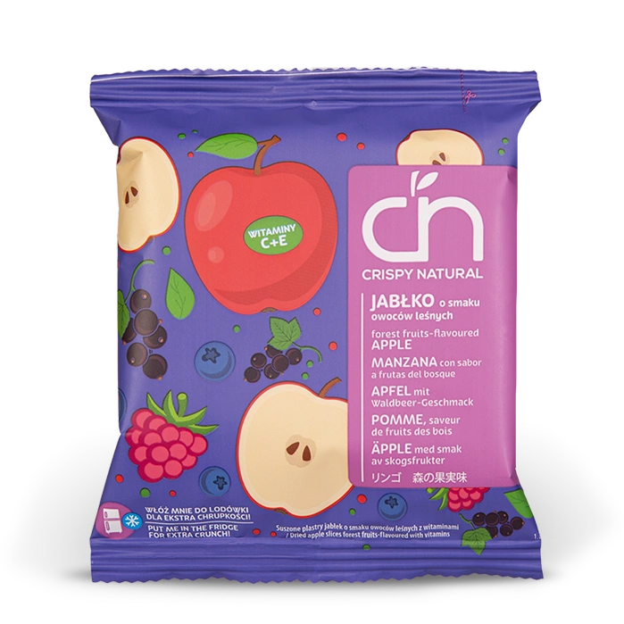 - Jabłka o smaku owoców leśnych to zdrowa przekąska, łącząca chrupiące suszone jabłka z owocami leśnymi, wzbogacona witaminami C oraz E.