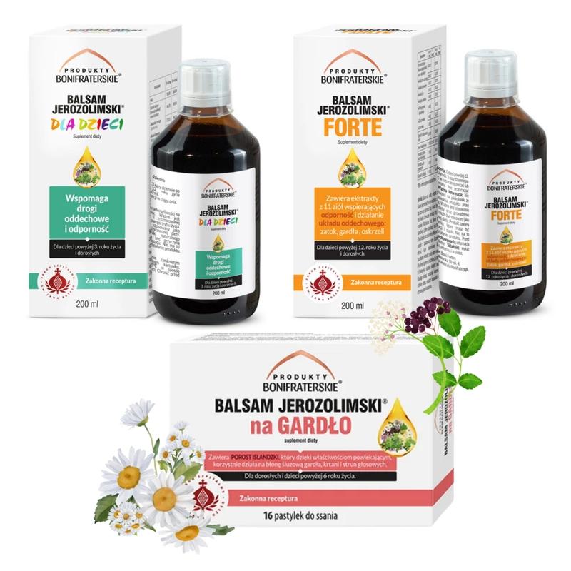 Produkty Bonifraterskie Balsam Jerozolimski dla całej rodziny + pastylki na gardło 3 opakowania