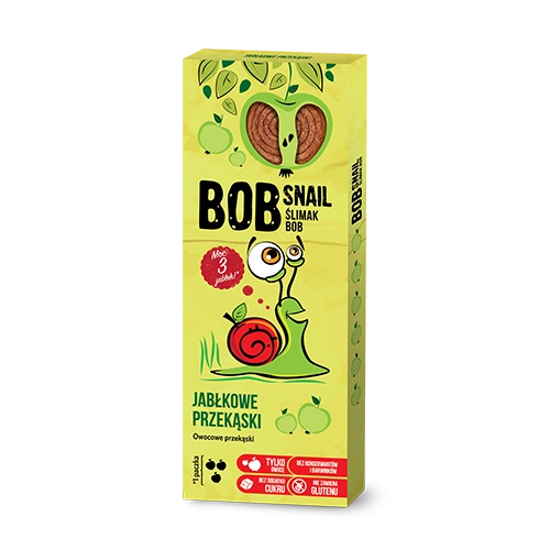 Ślimak Bob jest to owocowa, w 100% naturalna przekąska stworzona z myślą o najmłodszych. W poręcznym opakowaniu, stworzona wyłącznie z owoców nie zawiera konserwantów i barwników. Każda z przekąsek składa się z jabłka, które jest źródłem cennego błonnika pokarmowego. Przekąska jabłko idealnie sprawdzi się do szkoły, przedszkola, pracy czy w podróży. Do produkcji przekąsek Ślimaka Boba zostały wykorzystane najlepszej jakości owoce, które następnie zostały przetarte i upieczone w niskiej temperaturze. Dzięki tej innowacyjnej formie pieczenia, produkt ten nie traci swoich wartości mineralnych oraz witamin. Przekąska Ślimaka Boba świetnie sprawdzi się jako zamiennik tradycyjnych słodyczy.