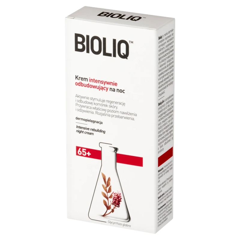 - Bioliq 65+, krem intensywnie odbudowujący na noc to zaawansowana nocna formuła, która wspiera skórę dojrzałą w procesach regeneracji i odbudowy komórkowej.