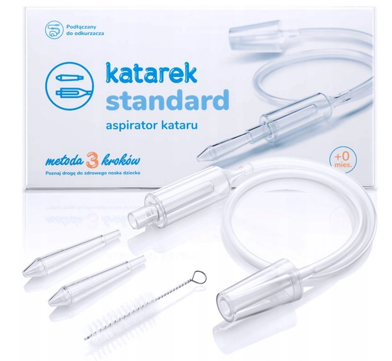 Aspirator Katarek Standard podłączany jest do domowego odkurzacza o mocy 800–1800W. Zredukowana, jednostajna siła ssąca sprawia, że jest on znacznie skuteczniejszy w porównaniu z ustnymi aspiratorami oraz tradycyjnymi gruszkami. Dzięki aspiratorowi Katarek Standard skutecznie i szybko pozbędziesz się wydzieliny z noska malca, przynosząc mu natychmiastową ulgę. Cały proces odciągania wydzieliny jest całkowicie bezpieczny dla każdego dziecka, już od pierwszego dnia życia. Produkt posiada dwie końcówki pozwalające na stosowanie go u dwójki dzieci jednocześnie.