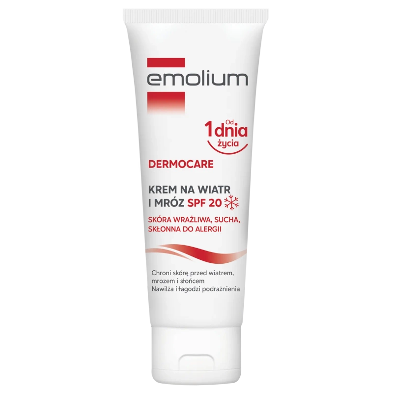 Krem na wiatr i mróz Emolium Dermocare to dermokosmetyk, który powstał w odpowiedzi na potrzeby skóry wrażliwej i wymagającej, zarówno dzieci od 1 dnia życia, jak i dorosłych. Krem na wiatr i mróz chroni skórę przed działaniem niskich temperatur, wiatru i suchego powietrza oraz wzmacnia jej naturalną barierę lipidową. Poprawia kondycję suchej skóry oraz zapobiega jej dalszemu przesuszaniu. Dzięki filtrom SPF20 chroni ją także przed działaniem słońca.